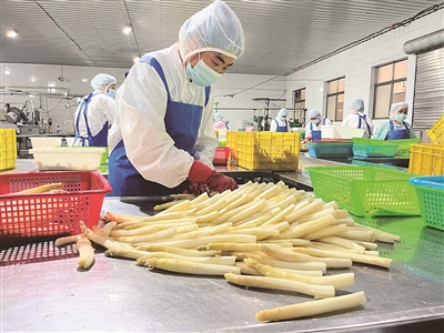我省芦笋出口企业加工车间内,工作人员正在对芦笋进行预处理。(李若男 摄)